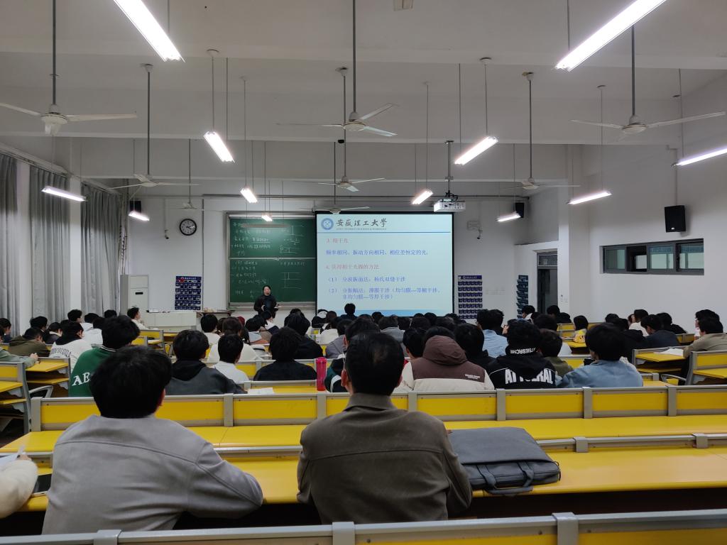 本次课程的主要内容为“波动光学”,课堂内容主要包含两个部分:光的相干性、杨氏双缝干涉实验。教学过程中,潘老师坚持“以学生为中心”的教育理念,先通过物理知识在医学方面的应用实例导入本堂课学习的内容,潘老师通过实际案例的深入剖析,自然地引出了后面的重点学习内容,将课程思政巧妙地融入课堂之中。