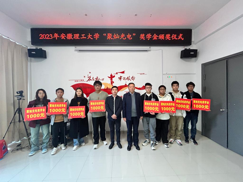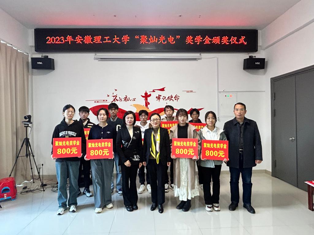 “聚灿光电奖学金”表彰仪式在明道楼A318举行。聚灿光电科技(宿迁)有限公司副总经理徐志军、人力资源部校园招聘副经理陈红应邀出席仪式。校党委常委、副校长宫能平,校合作发展处处长、校友会办公室主任刘艳,党委学工部部长、学生处处长涂有胜,色情传媒