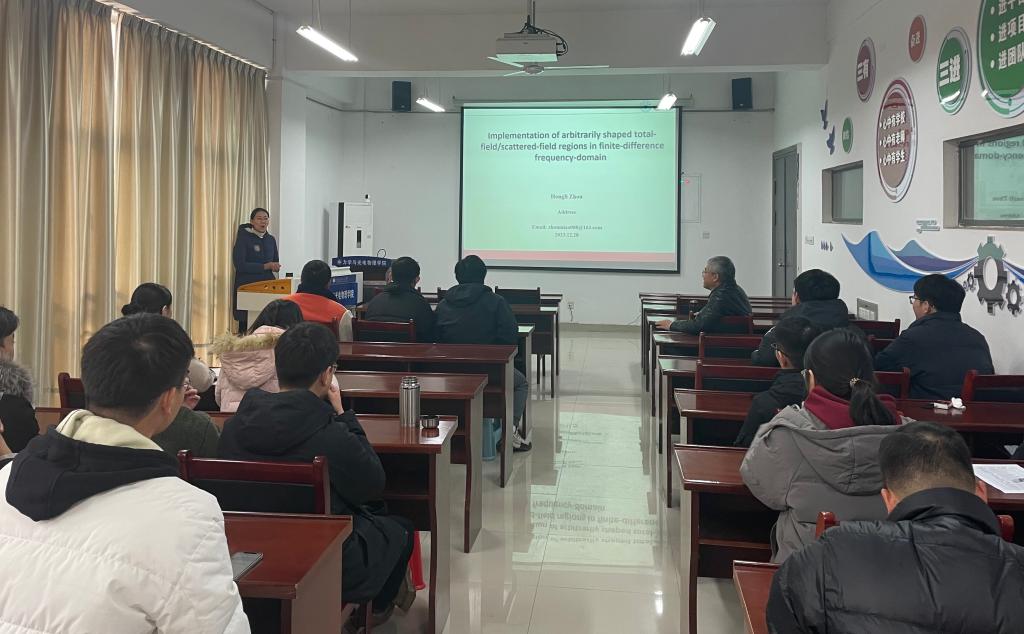 周宏丽副教授在明道楼A321报告厅做题为《Implementation of arbitrarily shaped total-field/scattered-field regions in finite-difference frequency-domain》的学术报告,报告会由院长王群教授主持,学院部分青年教师及研究生20余人参加了报告会。