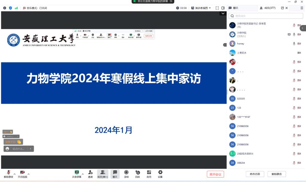 通过线上方式分毕业班和非毕业班两种学生群体开展2024年寒假线上集中家访活动。学院学生工作负责人、全体辅导员、学生资助宣传大使,以及500余名学生家长参加会议。