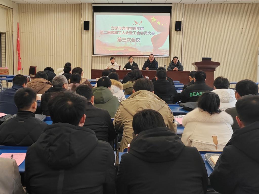 在明道楼一楼报告厅召开第二届教职工大会暨工会会员大会第三次会议。会议由学院党委书记孙东升主持,学院领导班子成员及全体教职工参加会议。