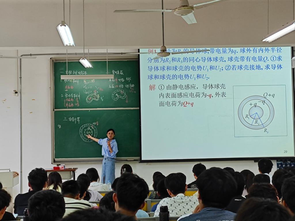 本次课程的主要内容为“静电场中的导体”,课堂内容主要包含三个部分:空腔导体电荷分布、静电屏蔽、有导体存在时场量的计算。教学过程中,汪老师先通过我国著名的建筑物鸟巢等进行知识点导入,自然而然地引出了后面的课程内容,将课程思政巧妙地融入了课堂之中。