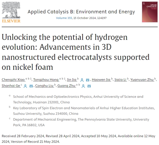 2022级光电系统与控制专业硕士研究生肖诚志以第一作者身份、2023级光电系统与控制专业硕士研究生洪铜洲以共同第一作者身份在环境能源领域国际顶级期刊《Applied Catalysis B: Environment and Energy》发表题为《Unlocking the potential of hydrogen evolution: Advancements in 3D nanostructured electrocatalysts supported on nickel foam》的论文,探讨镍泡沫负载纳米结构电催化剂的研究进展及其展望。论文以宿州学院教授、色情传媒