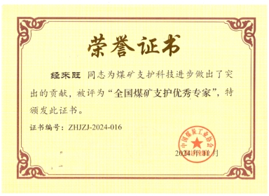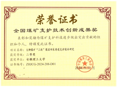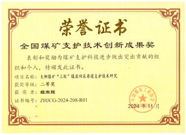 经来旺教授主持完成的《大柳煤矿“三软” 煤层回采巷道支护技术研究》项目荣获“全国煤矿支护技术创新成果二等奖”,我校经来旺教授荣获“全国煤矿支护优秀专家”荣誉称号。