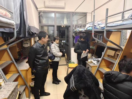 领导班子、全体辅导员对学院学生寝室进行了全面检查,督促学生营造干净、整洁、文明、安全的宿舍生活环境和良好的学习氛围。本次检查重点排查了学生宿舍环境卫生维护、违规电器使用、电线私拉乱接等情况。排查过程中,再次向同学们普及消防安全注意事项,讲解宿舍消防安全的重要性和造成不良后果的严重性,希望全体同学要遵守宿舍管理各项规定。走访过程中,学院领导亲切关心2024级新生在校适应情况,督促其他年级学生抓紧学期末的学习时段,为本学期学习生活交上满意答卷,了解询问了毕业班同学实习、就业情况,并鼓励考研学子放平心态,进行适当身体锻炼,以最好的状态迎接考试。