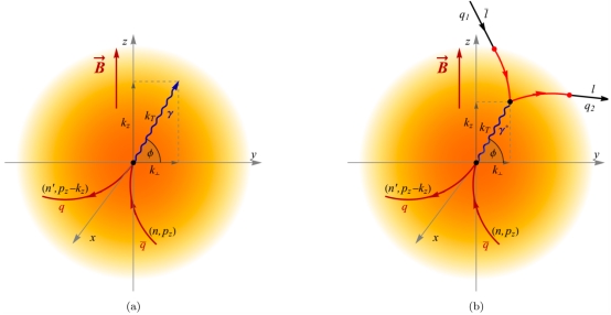 磁化等离子体的光子(a)和双轻子(b)发射示意图