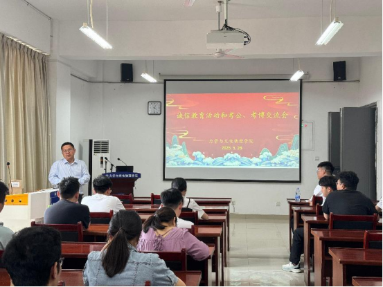 在明道楼A321报告厅举行了研究生诚信教育和考公、考博经验交流会。学院光电物理系主任李洋、辅导员及全体研究生参加了会议。