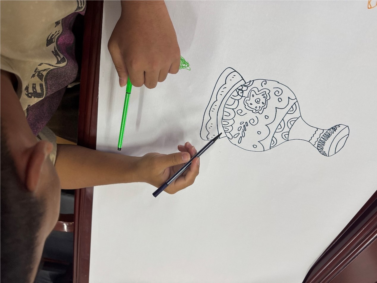 7月9日—10日,志愿队结合儿童认知特点,精心设计了系列传统文化体验活动。志愿者们展示了多民族特色服饰,讲解纹样蕴含的文化寓意;图文并茂地介绍了青花瓷的历史与艺术特色,让孩子们感受中华文化的深厚底蕴。动手环节中,孩子们在5米长卷上自由创作,勾勒民族服饰、描绘青花纹样;在非遗剪纸体验中,学习基础剪法,创作自己的剪纸作品。“感知—理解—创作”的过程,让孩子们近距离触摸传统文化魅力,培养了审美情趣与文化认同感,让文化传承的种子在童真心田悄然扎根。
