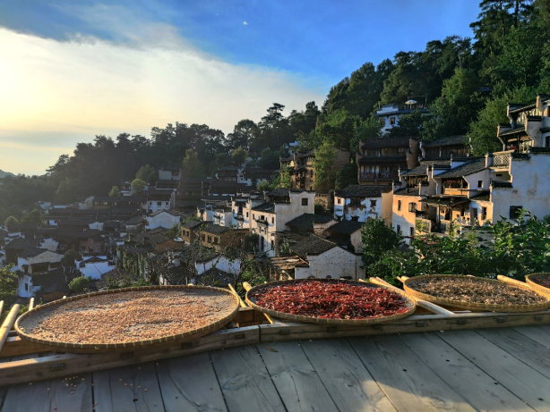 为深入探索和开发“传统村落+旅游”新模式,继续推进文化遗产与旅游融合,7月12日下午,实践团前往婺源县篁岭村进行调研。篁岭村有着经典的徽派建筑,依山傍水,融汇于山水之中,建筑以白墙黛瓦为特色,还有着精美的砖雕、石雕和木雕。篁岭古村以独特的“晒秋景观”而火遍大江南北,每到收获之时,由于篁岭村地势起伏不平,没有大块面积让村民晾晒农作物,只能在窗台上搭建晾架将农作物放入晒匾中晾晒,形成了独特的“晒秋”农俗景观。