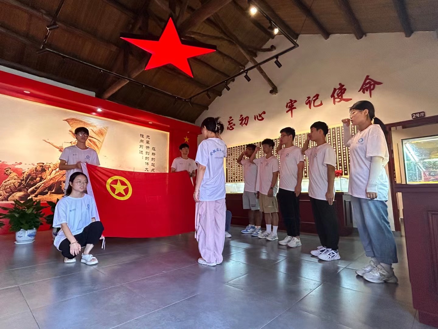 在中共婺源县委旧址内,实践团全体队员举右拳郑重宣誓,重温入团誓词。在团旗下接受心灵和精神的净化与洗礼。掷地有声的入团誓词,时刻警醒着同志们奋勇拼搏、砥砺前行。