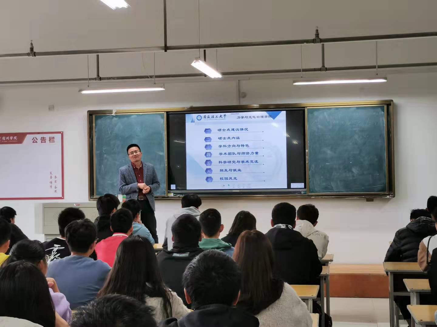 的基本情况以及研究生招生的基本政策。光电物理系陈昌兆老师重点对光电系统与控制硕士点的相关情况作了专门的ppt讲解,讲解内容涉及硕士点建设历程、硕士点内涵和专业方向设置、学术团队和师资、科学研究与学术交流、招生和就业、奖助体系等多个方面,宣讲现场人数众多、气氛热烈。