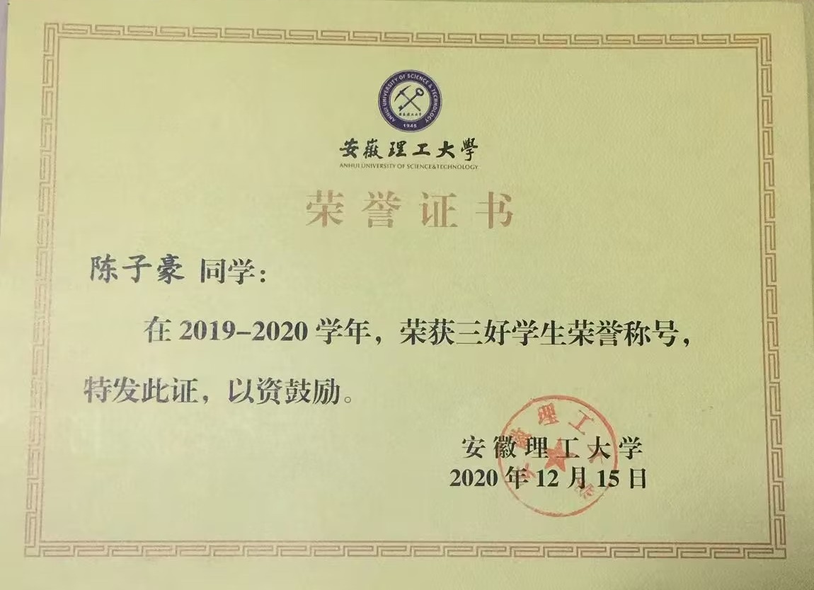 陈子豪,光电信息19-1团支书,中共党员,校奖学金获得者,三好学生,优秀共青团干部。考研录取合肥工业大学光学工程专业。
