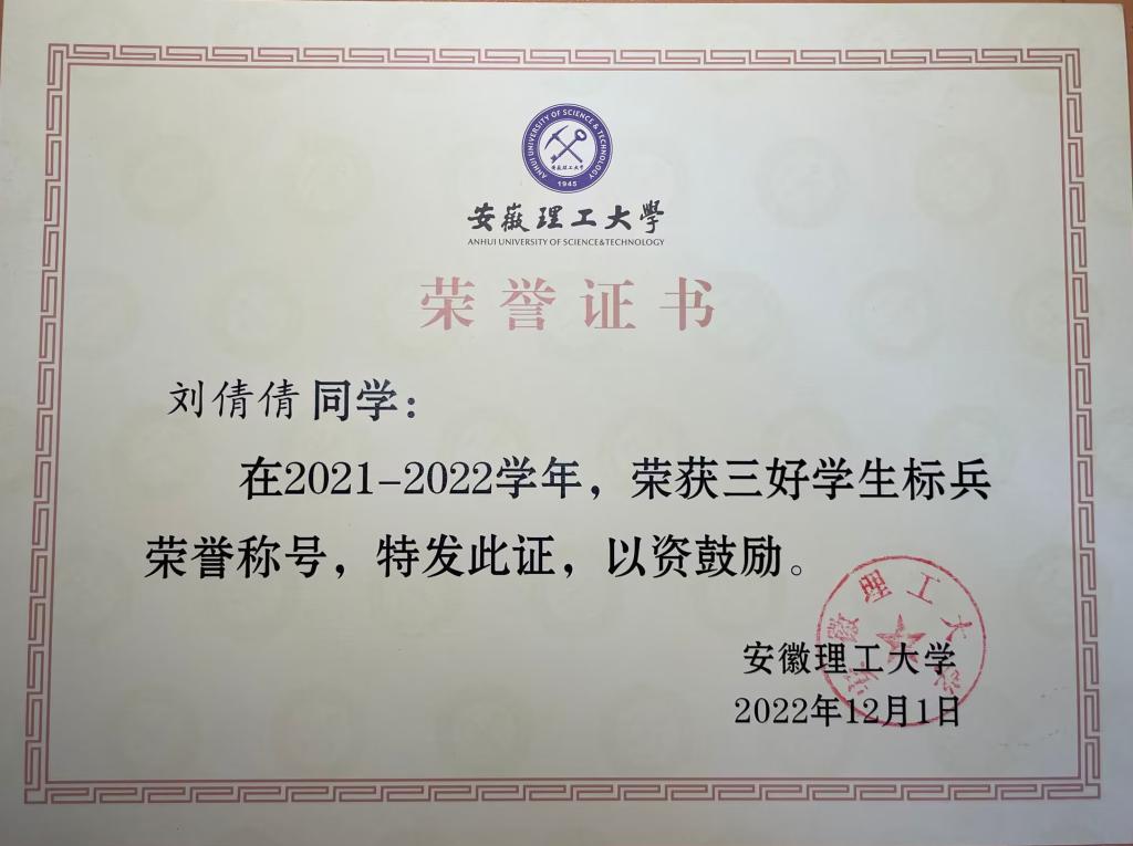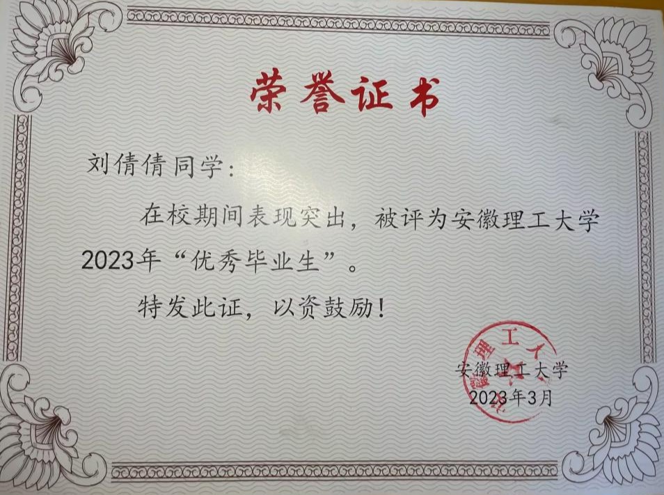 刘倩倩,光电信息19-1学习委员,中共党员,励志奖学金获得者,三好学生,优秀学生干部。该生获得硕士研究生推免资格,顺利录取西安电子科技大学光学工程专业。