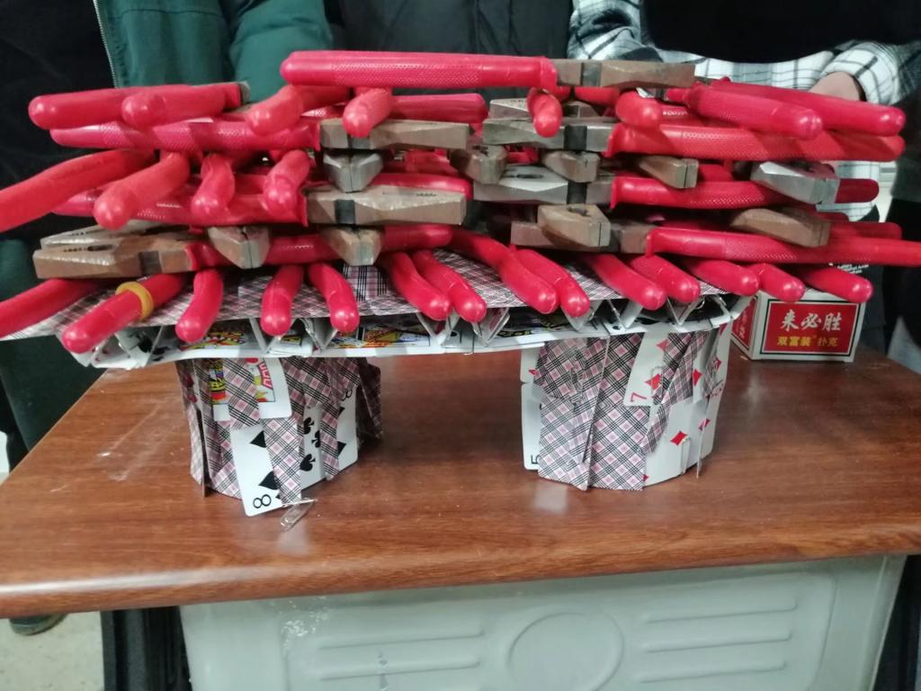 比赛中,参赛选手只允许使用两副纸牌、胶水、回形针和剪刀等工具材料,制作并搭建起一座纸牌桥。同时纸牌桥梁要求两点桥墩的跨度不小于30cm,桥面宽度不小于10cm,地面到最低桥面不小于10cm,以稳固程度和承重为评分标准,决出获胜者。最终,马岚和刘善宇同学获一等奖,二等奖四人,三等奖六人。