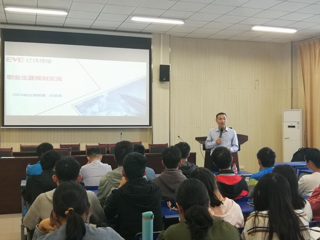 举办优秀校友报告会,2003级应用物理学专业校友、惠州亿纬锂能股份有限公司人力资源总监刘德成应邀在明道楼一楼报告厅作励志专题报告,学院2017级应用物理学、光电信息科学与工程专业70余名学生参加了会议。会议由学院党委副书记(兼副院长)张可佳主持。