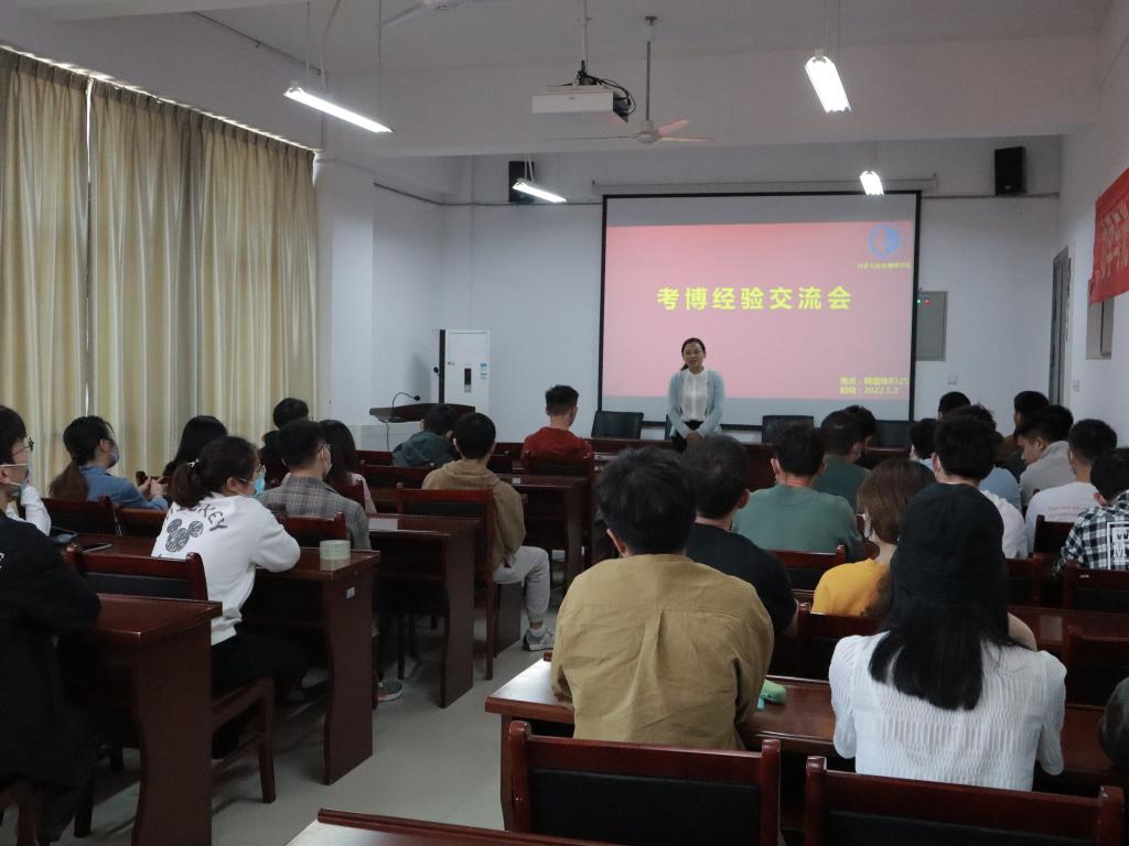 在院报告厅举办了考博经验交流会。会议邀请2022届毕业生刘云开和殷允桥作经验分享,特邀副院长高娟教授发表讲话,2020、2021级硕士参加了交流会。
