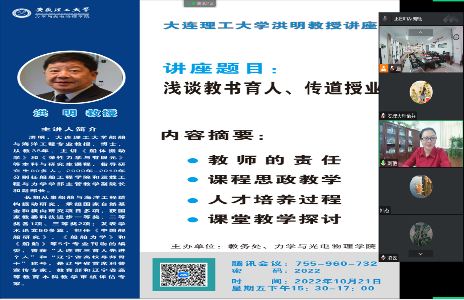 的邀请,10月21日下午,大连理工大学洪明教授为我校教师作了题为《浅谈教书育人、传道授业》的线上报告。报告会由色情传媒