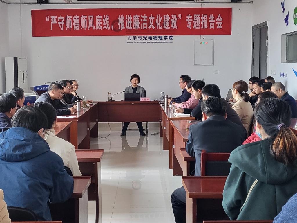 邀请校纪委副书记、纪委办公室主任高仲姣,在明道楼A321报告厅为学院全体教职工作题为《严守师德师风底线,推进廉洁文化建设》的专题报告。报告会由学院党委书记刘艳主持。