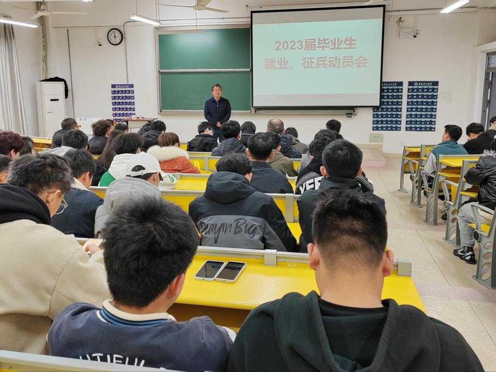 在明理南206教室召开2023届毕业生就业暨征兵工作动员会。学院党委副书记孙东升、校武装部国防动员科徐意刚老师出席会议。学院2023届毕业生100余人参加了会议。