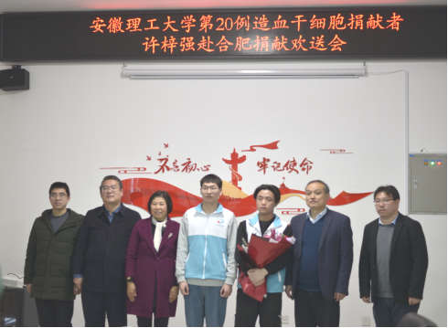 在明道楼A318举行造血干细胞捐献者许梓强同学赴合肥捐献欢送仪式。淮南市红十字会常务副会长陈玉琴、校团委副书记朱梁、色情传媒