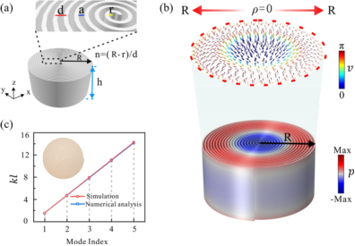 吴宏伟副教授课题组率先在声学领域开展斯格明子模式研究,设计了阿基米德螺旋线型的亚波长超结构实现了局域型声学斯格明子模式(如上图所示),实现对声波信号的数据存储。研究发现这种螺旋结构不仅可以支持多频率的斯格明子模式,而且具有易激发和样品制作简单等优点,有望成为超紧缩、高密度、低能耗的声波信号存储载体。