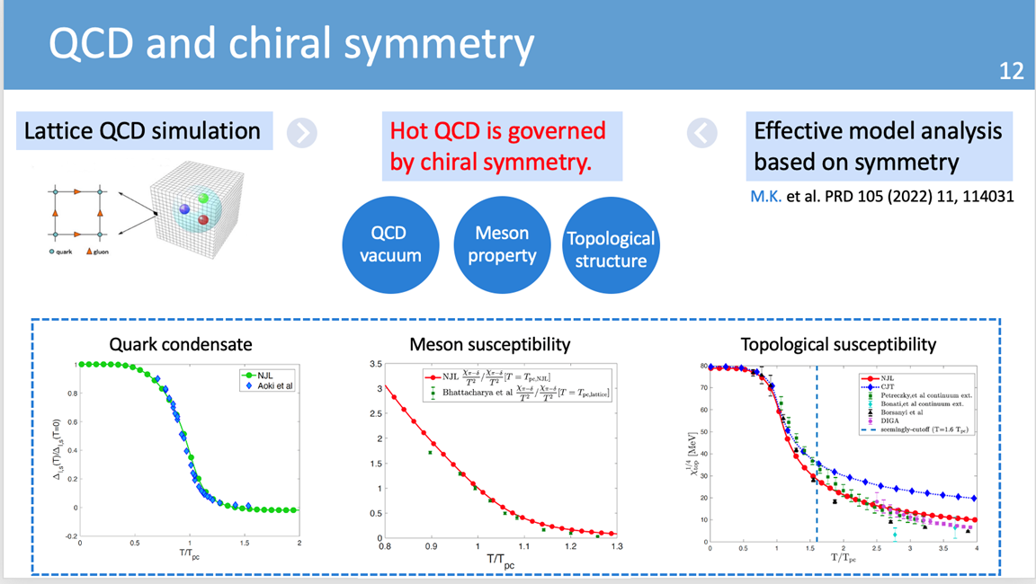 在极端条件下研究量子色动力学(QCD),例如重离子碰撞物理、中子星天体物理以及早期宇宙宇宙学,对于揭示QCD非微扰性质的新特征非常重要。为了深入理解这些极端体系,需要研究QCD的非微扰性质,尤其是QCD相变。近年来,格点QCD等第一性原理计算提供了大量有限温度和密度下的数据。尽管这些数据对于研究QCD相变很有价值,但其物理意义尚未完全理解。本次报告中,Mamiya介绍了他们采用有效模型并与格点结果进行比较,以提取QCD在极端条件下非微扰性质的新见解。最后,与参会老师们就相关研究等内容展开热烈讨论,王群教授作了详细点评。